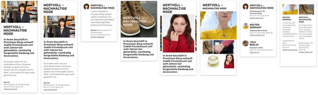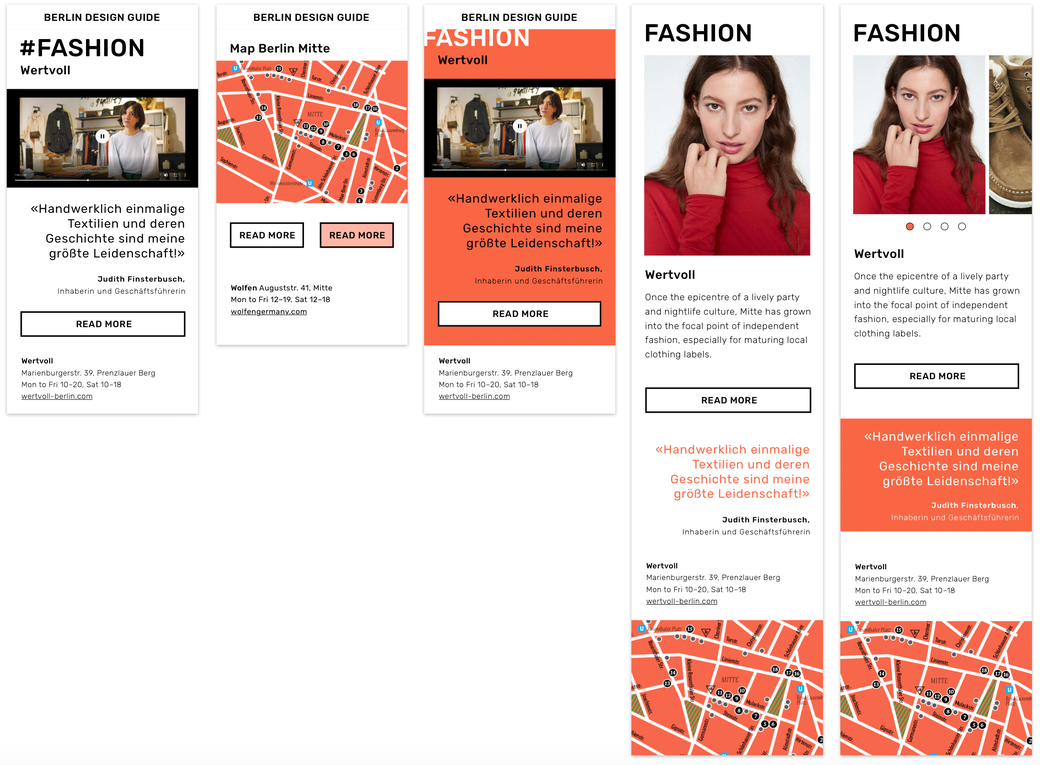 Bei den Artikelseiten versucht man die verschiedenen Komponenten wie Text, Bild/Map, Buttons und Farbe miteinander zu kombinieren.