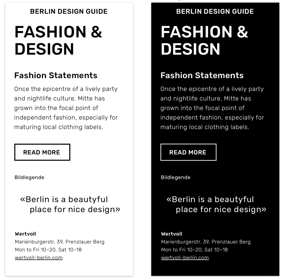 Mit einem Schrifttest finde ich heraus, ob die von mir gewählte Schrift passt. Auf einem Artboard der Grösse eines Mobilephones setze ich alle möglichen Textvarianten wie Titel, Untertitel, Lead, Lauftext, Button, Bildlegende, Claim oder Spruch und die Adresse. So finde ich heraus, ob die Schrift zum Thema passt, die Grössenverhältnisse zueinander stimmen, der Zeilenabstand passt und alles gut leserlich ist. Wenn man in der 2. Version alles negativ setzt, sieht man wie es auf einem schwarzen Hintergrund oder Bild wirkt.
